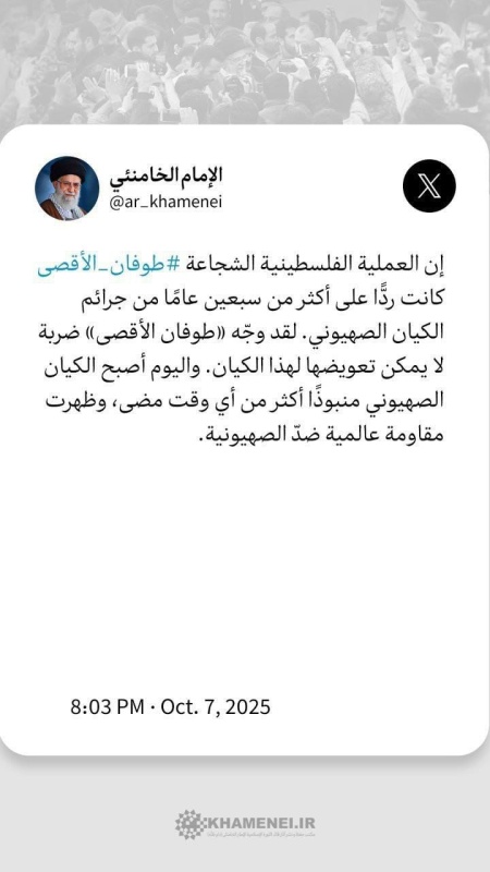 أكد قائد الثورة الاسلامية في ايران اية الله العظمى سماحة السيد علي الخامنائي، اليوم الثلاثاء (7 تشرين الأول 2025)، أن العملية الفلسطينية الشجاعة "طوفان الأقصى" جاءت رداً على أكثر من سبعين عاماً من جرائم الكيان الصهيوني.