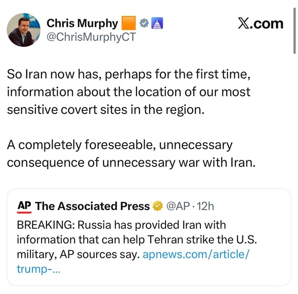 وقال مورفي في تدوينه عبر حسابه على منصة "اكس" إن "إيران أصبحت الآن، وربما للمرة الأولى، تمتلك معلومات عن مواقع شديدة الحساسية وسرية للقوات الأمريكية في المنطقة"، مضيفاً أن "هذا التطور يمثل نتيجة يمكن التنبؤ بها تماماً، وغير ضرورية، لحرب غير ضرورية مع إيران".