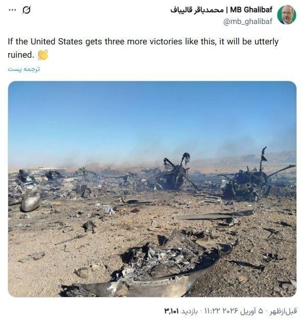 سخر محمد باقر قاليباف رئيس برلمان إيران من الإنجازات الأمريكية، عقب الإعلان عن إنقاذ الطيار الذي أسقطت مقاتلته وسط البلاد معتبرا أن "المزيد من هذه النجاحات سيعني نهاية واشنطن"، حيث ذكر قاليباف في منشور له تعليقا على تدمير الطائرات والمروحيات الأمريكية: "إذا حققت أمريكا ثلاثة انتصارات أخرى مشابهة لهذا، فسيتم تدميرها بالكامل".