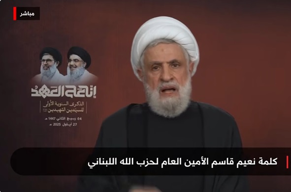 وشدد بحزم: لن نسمح بنزع السلاح وسنخوض مواجهة كربلائية، وسنواجه أي مشروع يخدم "إسرائيل" ولو أُلبس اللبوس الوطني.