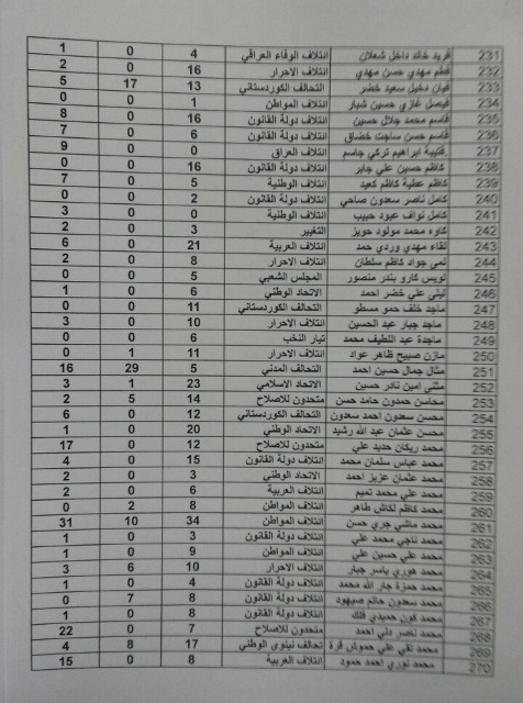 ويظهر امام اسم كل النواب اربعة حقول يتضمن الاول الكتلة التي ينتمي اليها والحقل الثاني عدد ايام الاجازات، والحقل الثالث عدد ايام الاجازات المرضية، فيما يتضمن الجدول الرابع والاخير عدد ايام الغيابات
