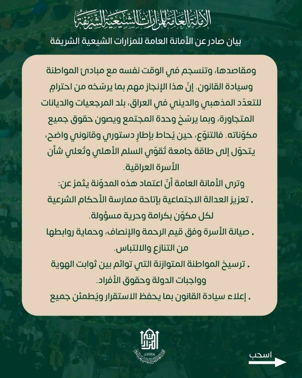 الامانة العامة للمزارات الشيعية في العراق تصدر بيانها بخصوص مدونة الاحكام الشرعية في مسائل الاحوال الشخصية على وفق المذهب الشيعي الجعفري