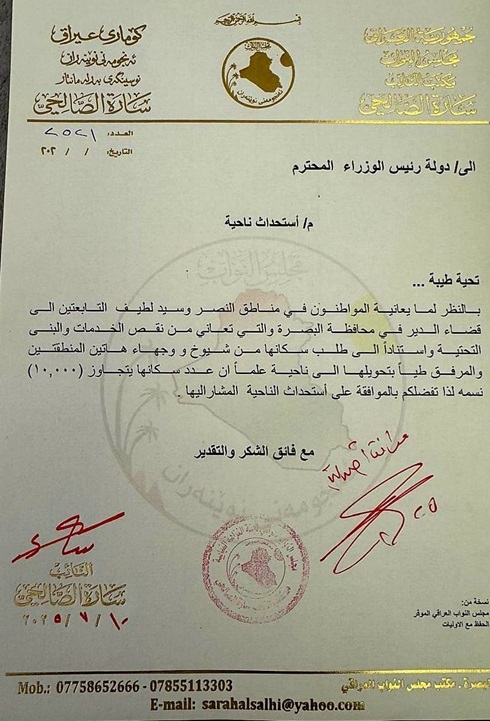 اعلنت عضو لجنة النزاهة النيابية، النائب سارة الصالحي ، عن استحصالها موافقة رئيس الوزراء على تحويل منطقتي النصر وسيد لطيف التابعتين لقضاء الدير ،شمالي البصرة ، الى ناحية مستقلة.