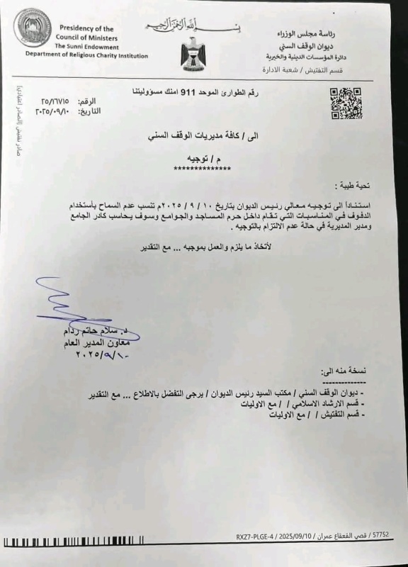 أظهرت وثيقة صادرة من ديوان الوقف السني، بتاريخ اليوم الأربعاء (10 أيلول 2025)، توجيهاً إلى كافة مديريات الوقف بعدم السماح باستخدام الدفوف في المناسبات التي تُقام داخل المساجد والجوامع، على أن تتم محاسبة المخالفين وفق الضوابط.