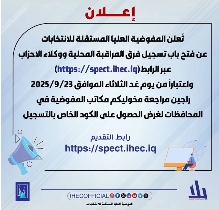أعلنت المفوضية العليا للانتخابات، الاثنين، عن فتح باب تسجيل فرق المراقبة المحلية ووكلاء الأحزاب اعتباراً من يوم غد الثلاثاء.