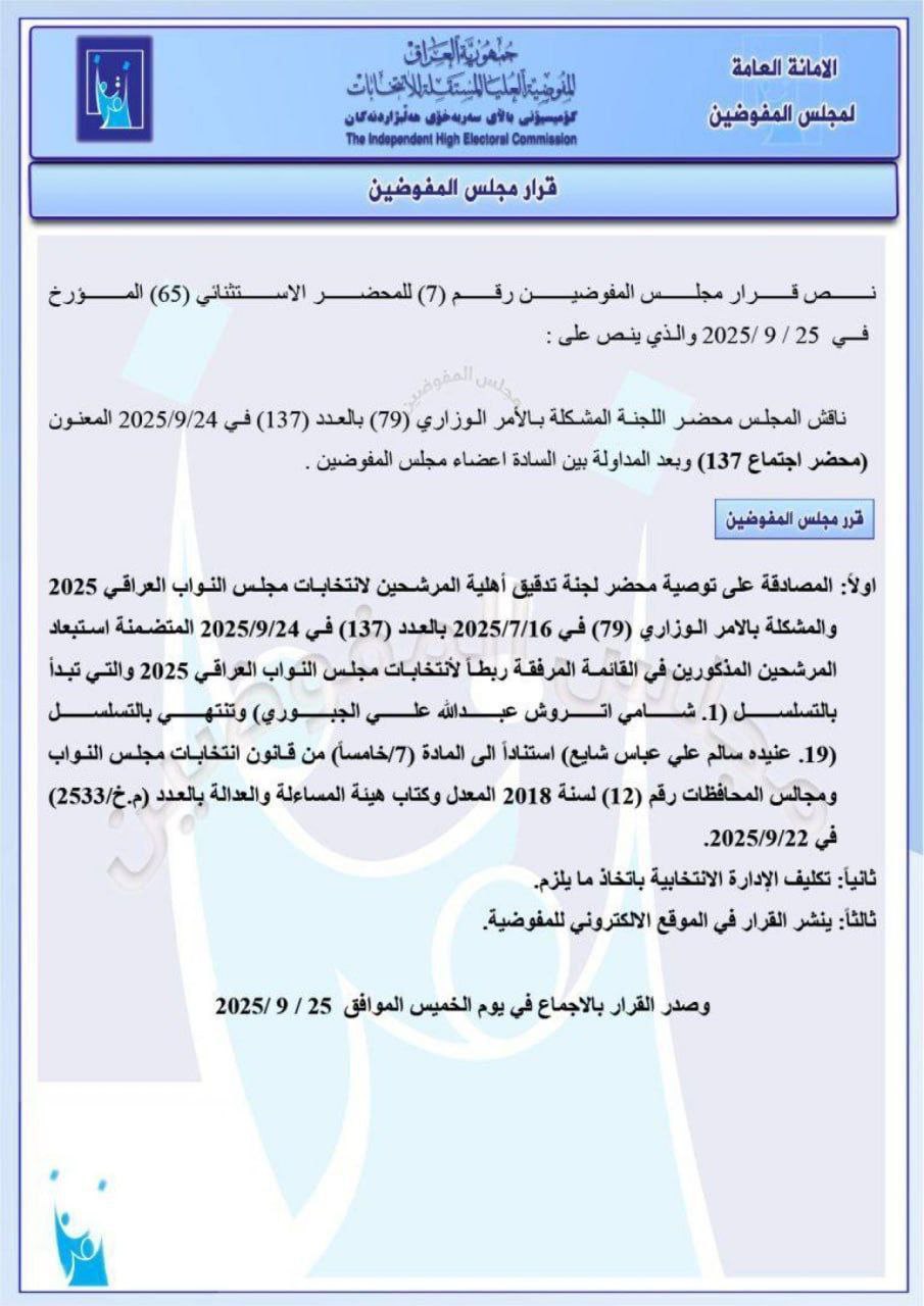مجلس المفوضين يصادق على استبعاد 19 مرشحاً من انتخابات مجلس النواب