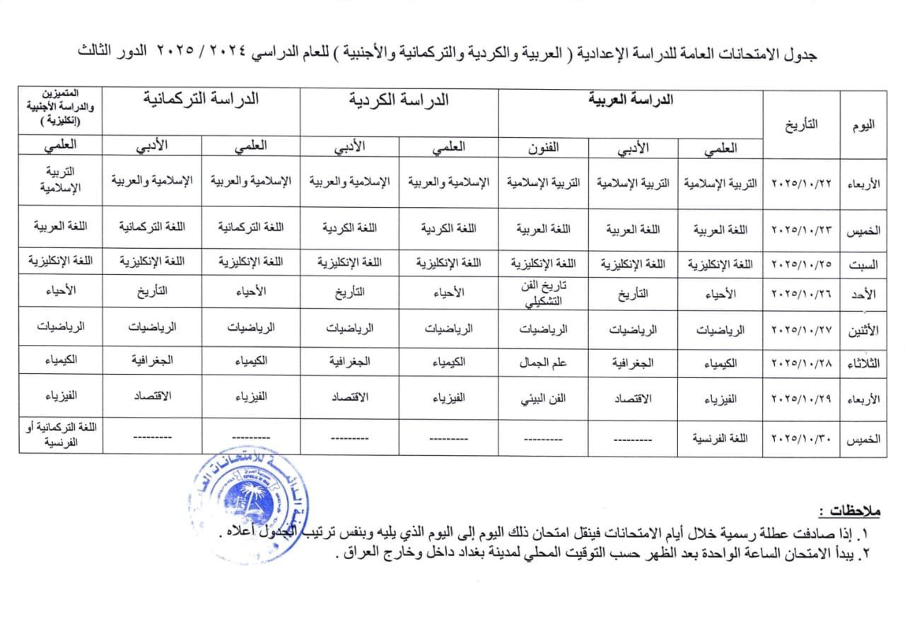 اعلنت اللجنة الدائمة للامتحانات العامة في وزارة التربية جدول الامتحانات الوزارية / الدور الثالث للعام الدراسي ۲۰۲٤_٢٠٢٥ للمراحل كافة ( الابتدائية والمتوسطة واالإعدادية بفرعيها العلمي والأدبي ) للدراسات العربية والكردية والتركمانية