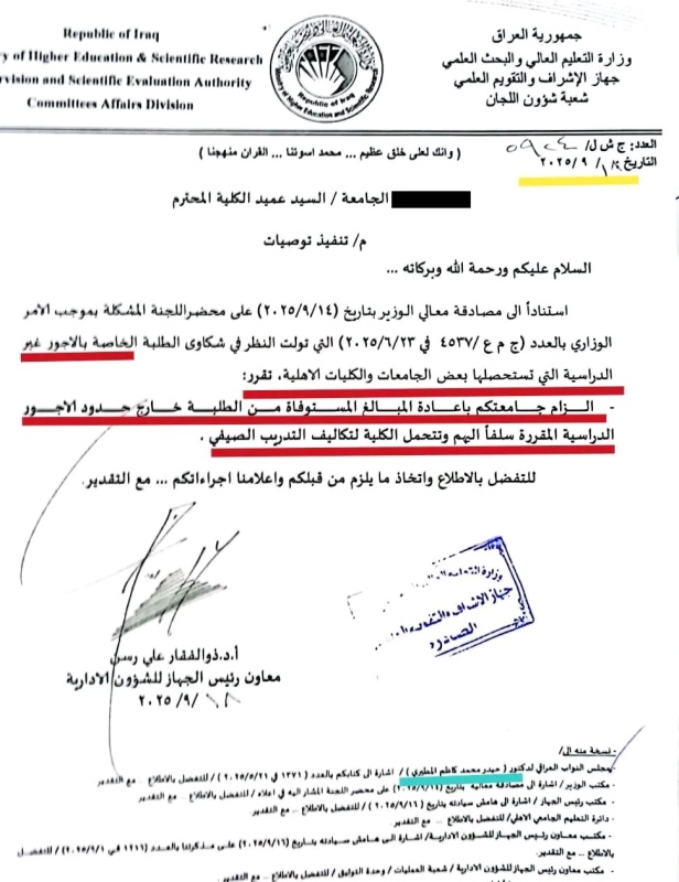 أصدرت وزارة التعليم العالي والبحث العلمي، بتاريخ (18 أيلول 2025)، قراراً يلزم الجامعات والكليات الأهلية بإعادة المبالغ المالية المستوفاة من الطلبة خارج الأجور الدراسية المقررة سابقاً.