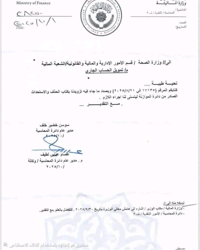 وبحسب وثيقة اليوم السبت (4 تشرين الأول 2025)، فإن "وزارة المالية طلبت من وزارة الصحة تزويدها بقوائم الحذف والاستحداث، لإطلاق العلاوات والترفيعات".