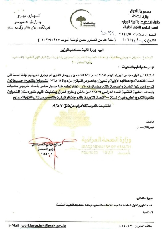 وبحسب كتاب للصحة، اليوم الأربعاء، (8 تشرين الأول 2025)، فأن "مخاطبة وزارة المالية جاءت لغرض تنفيذ قرار مجلس الوزراء بشأن تعيين خريجي كليات الطب العام والكليات والمعاهد الطبية والتقنية المشمولين بـقانون تدرج ذوي المهن الطبية والصحية رقم (6) لسنة 2000".
