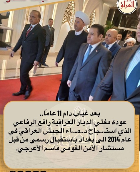 افاد مصدر صحفي ان ما يسمى بمفتي الديار العراقية السابق المدعو رافع الرافعي قد عاد الى العراق وكان باستقباله مستشار الامن القومي قاسم الاعرجي فضلا عن عدد من رؤساء الاحزاب السنية