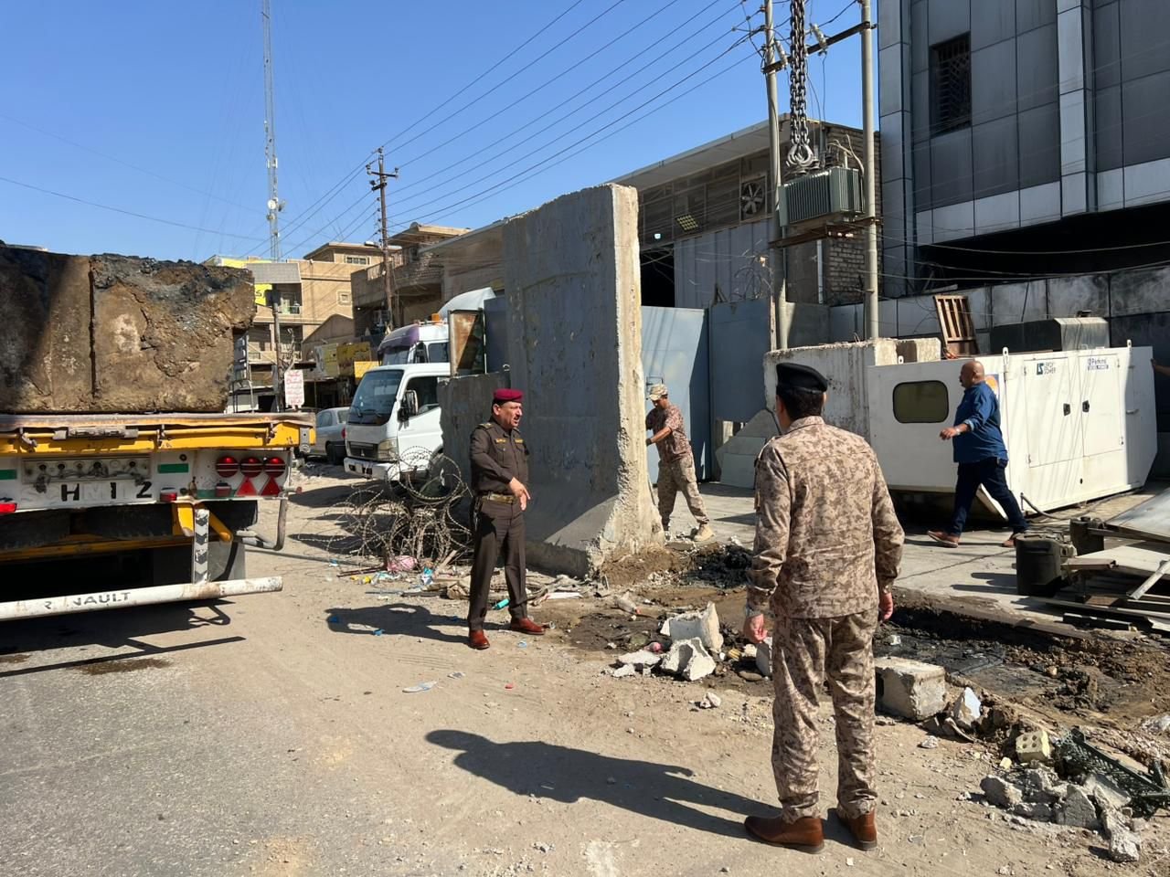 عمليات بغداد تباشر برفع الكتل الكونكريتية المحيطة بمصرف الرشيد فرع الحسينية