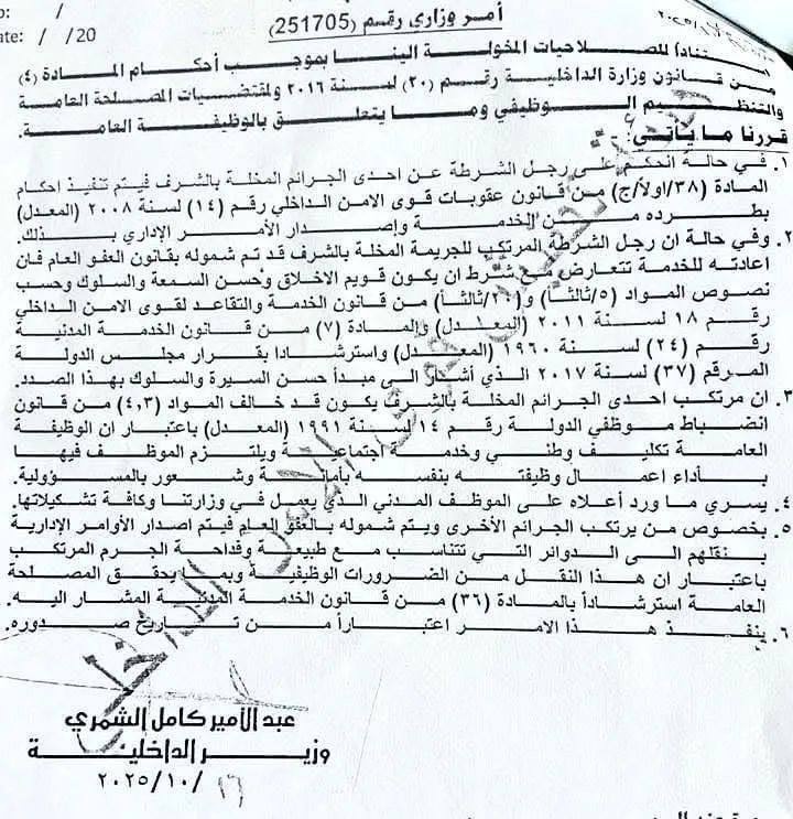 وبحسب وثيقة اليوم الأربعاء (22 تشرين الأول 2025)، فإن "وزير الداخلية حدد ضوابط إعادة المنتسبين والموظفين المدنيين في الوزارة إلى الخدمة بعد شمولهم بالعفو العام"، مؤكدةً أن المشمول بالعفو في قضية مخلة بالشرف لا يُعاد إلى الخدمة".