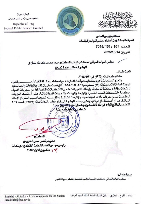 وأضاف، ان "موضوع الكتاب الذي تم تداوله هو كان جواب على كتاب النائب (حيدر المطيري) حول موضوع اعادة التعيين المتوقف استنادا إلى نص المادة (14/ ثانيا/ أ) من قانون الموازنة الثلاثية الاتحادية رقم 12 وقرار مجلس الدولة المرقم (7/2025) لعام 2025".