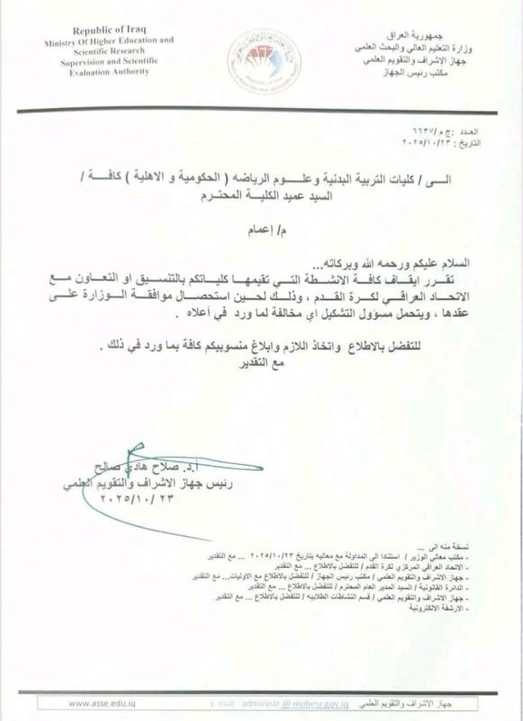 أعلنت وزارة التعليم العالي والبحث العلمي، جهاز الإشراف والتقويم العلمي، اليوم الخميس، عن قرار إيقاف جميع الأنشطة التي تقيمها كليات التربية البدنية وعلوم الرياضة (الحكومية والأهلية) بالتنسيق أو التعاون مع الاتحاد العراقي لكرة القدم، لحين استحصال موافقة الوزارة على عقدها.