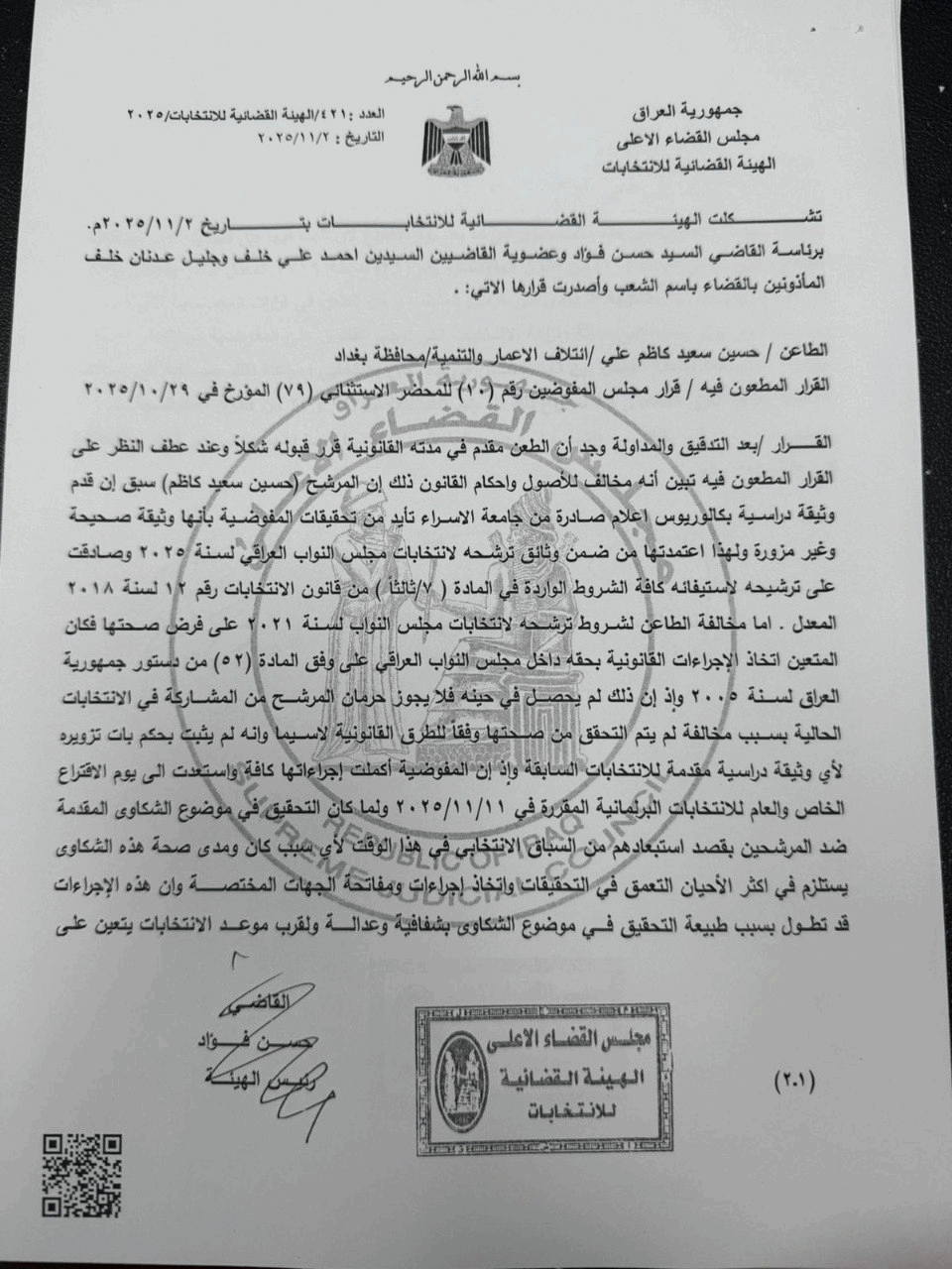 وكان حسين عرب قد استُبعِد من الانتخابات بقرار من مجلس المفوضين، يوم الأربعاء الماضي، على خلفية ورود وثيقة رسمية موجّهة من هيئة النزاهة الاتحادية إلى رئيس الإدارة الانتخابية في المفوضية، تُشير إلى عدم صحة صدور الوثائق المُقدَّمة من قِبَلِه، وفقاً لكتاب من جامعة الإمام جعفر الصادق.