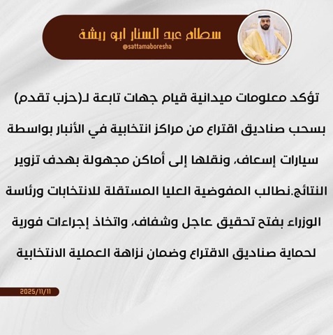 اتهم الشيخ سطام عبد الستار أبو ريشة، اليوم الثلاثاء (11 تشرين الثاني 2025)، جهات تابعة لحزب تقدم بالتورط في عمليات نقل غير قانونية لصناديق الاقتراع من بعض المراكز الانتخابية في محافظة الأنبار، مطالباً الحكومة والمفوضية العليا المستقلة للانتخابات بفتح تحقيق عاجل وشفاف.