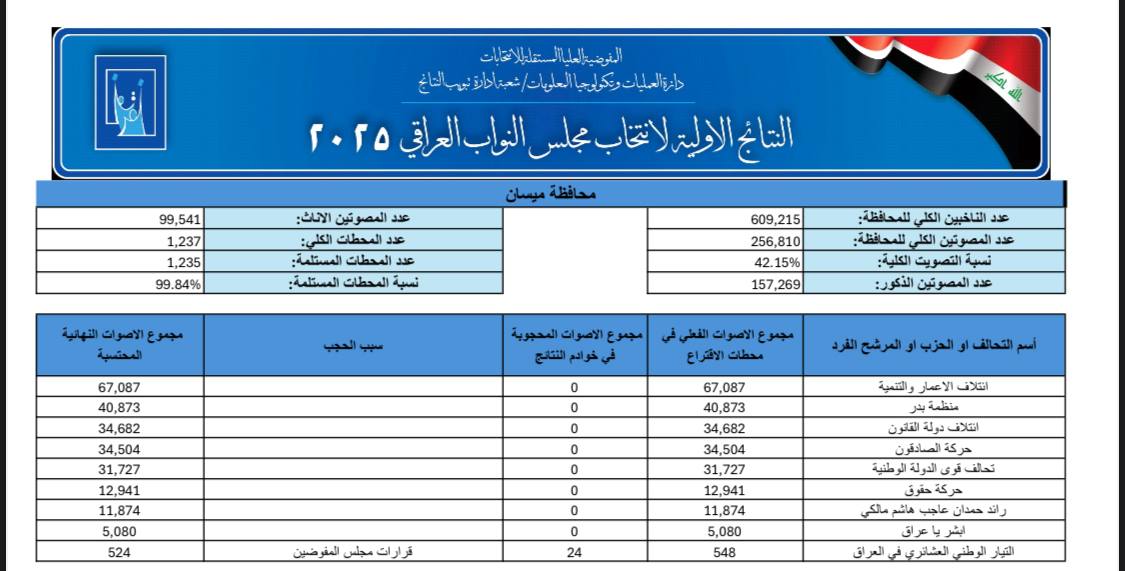نتائج الأولية انتخابات في محافظة ميسان