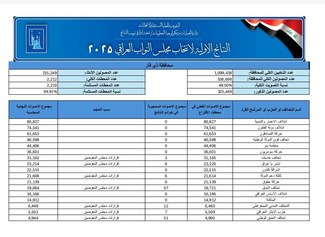 النتائج الأولية للانتخابات النيابية في ذي قار