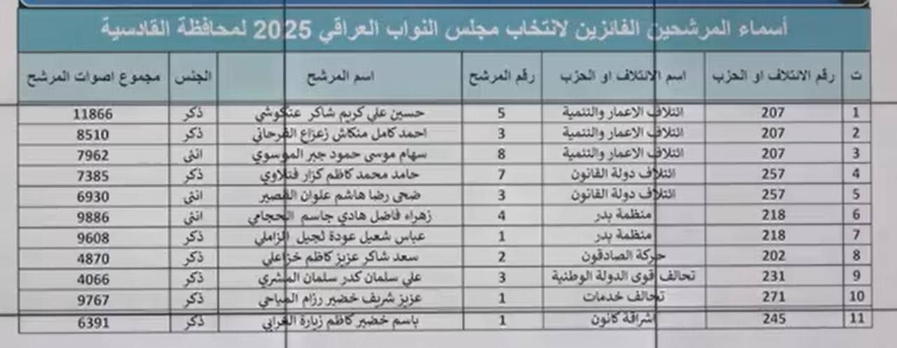 اسماء الفائزين في الانتخابات البرلمانية يمحافظة الديوانية