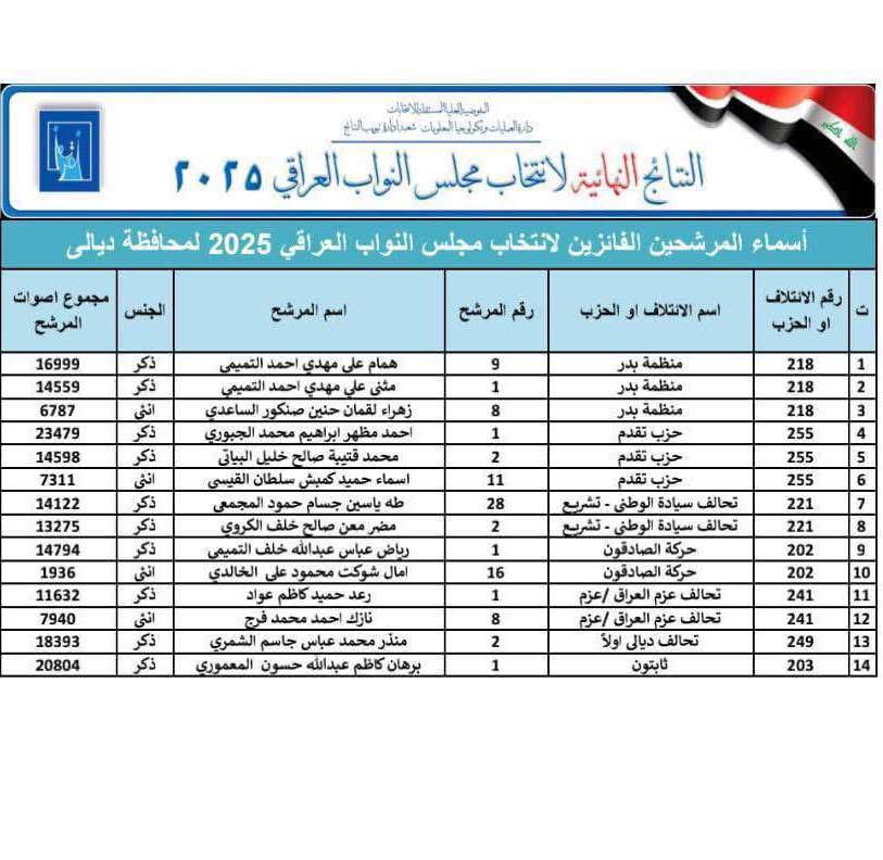 اسماء الفائزين في الانتخابات البرلمانية يمحافظة ديالى