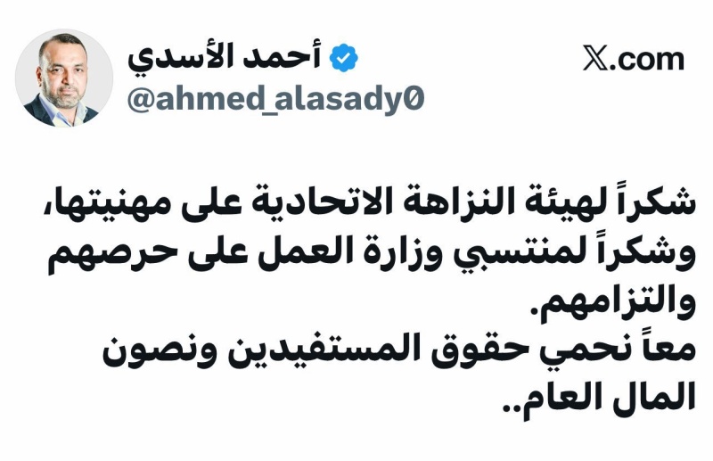 وقدم الأسدي في تغريدة لى حسابه في منصة (أكس)،، "شكره لمنتسبي وزارة العمل والشؤون الاجتماعية على ما أبدوه من حرص والتزام في أداء واجباتهم".