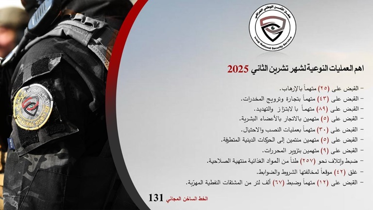 أعلن جهاز الأمن الوطني، اليوم الأحد، ( 30 تشرين الثاني 2025 )، عن حصيلة أهم عملياته النوعية خلال هذا الشهر.