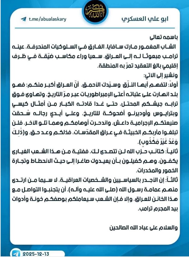العسكري مخاطباً سافايا: العراق أكبر منكم ..وتهاوى فوق ترابه جيشكم المحتل