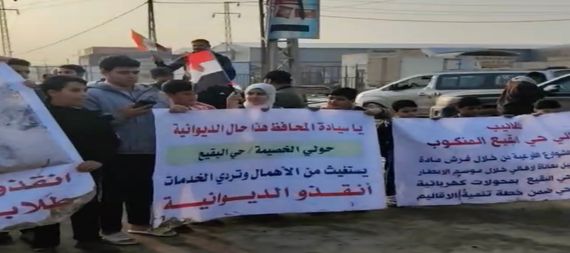 ظم اهالي حيي البقيع وحولي الخصيمة بمركز محافظة الديوانية تظاهرة مطالبين الحكومة المحلية بتوفير خدمات الماء والكهرباء والمجاري والتبليط