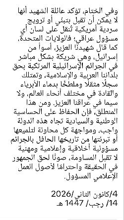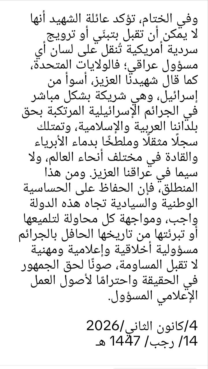 وفي الختام، تؤكد عائلة الشهيد أنها لا يمكن أن تقبل بتبنّي أو ترويج سردية أمريكية تُنقل على لسان أي مسؤول عراقي؛ فالولايات المتحدة، كما قال شهيدنا العزيز، أسوأ من إسرائيل، وهي شريكة بشكل مباشر في الجرائم الإسرائيلية المرتكبة بحق بلداننا العربية والإسلامية، وتمتلك سجلًا مثقلًا وملطخًا بدماء الأبرياء والقادة في مختلف أنحاء العالم، ولا سيما في عراقنا العزيز. ومن هذا المنطلق، فإن الحفاظ على الحساسية الوطنية والسيادية تجاه هذه الدولة واجب، ومواجهة كل محاولة لتلميعها أو تبرئتها من تاريخها الحافل بالجرائم مسؤولية أخلاقية وإعلامية ومهنية لا تقبل المساومة، صونًا لحق الجمهور في الحقيقة واحترامًا لأصول العمل الإعلامي المسؤول.