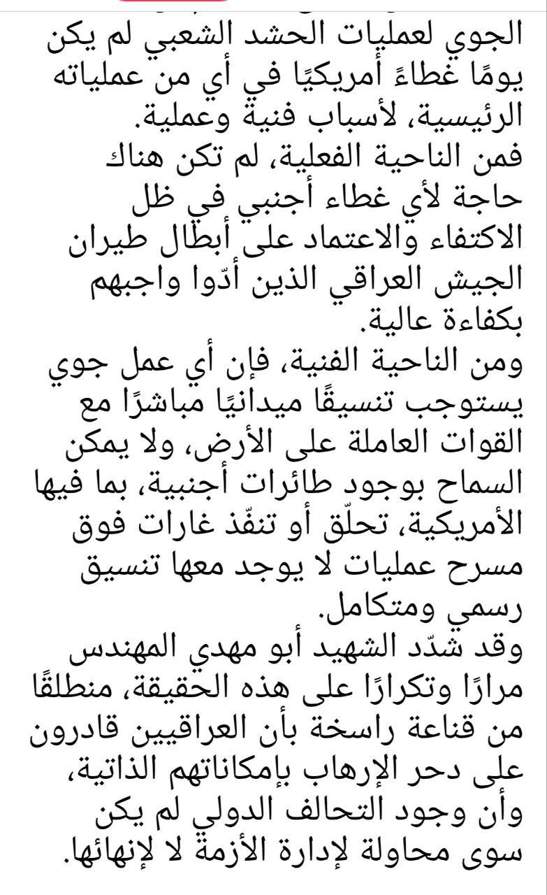 نؤكد بشكل واضح وحاسم أن الغطاء الجوي لعمليات الحشد الشعبي لم يكن يومًا غطاءً أمريكيًا في أي من عملياته الرئيسية، لأسباب فنية وعملية.