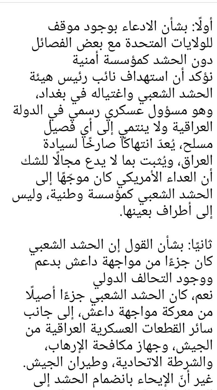 أولًا: بشأن الادعاء بوجود موقف للولايات المتحدة مع بعض الفصائل دون الحشد كمؤسسة أمنية