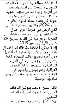 نؤكد أن استهداف نائب رئيس هيئة الحشد الشعبي واغتياله في بغداد، وهو مسؤول عسكري رسمي في الدولة العراقية ولا ينتمي إلى أي فصيل مسلح، يُعدّ انتهاكًا صارخًا لسيادة العراق، ويُثبت بما لا يدع مجالًا للشك أن العداء الأمريكي كان موجّهًا إلى الحشد الشعبي كمؤسسة وطنية، وليس إلى أطراف بعينها.
