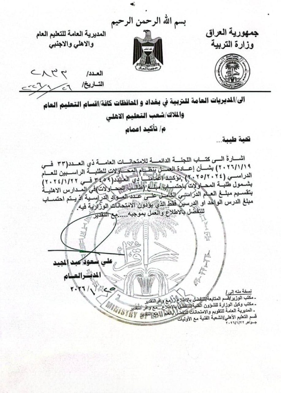 أوضحت وزارة التربية، اليوم الإثنين ( 26 كانون الثاني 2026 )، آلية استيفاء مبالغ طلبة المحاولات في المدارس الأهلية، مؤكدة الالتزام بالتعليمات النافذة.
