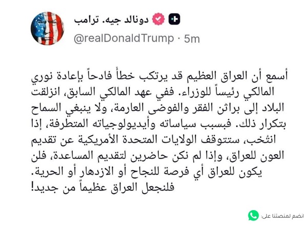 وقال ترامب: "أسمع أن العراق العظيم قد يرتكب خطأ فادحاً بإعادة نوري المالكي رئيساً للوزراء". وأضاف: "ففي عهد المالكي السابق، انزلقت البلاد إلى براثن الفقر والفوضى العارمة، ولا ينبغي السماح بتكرار ذلك".