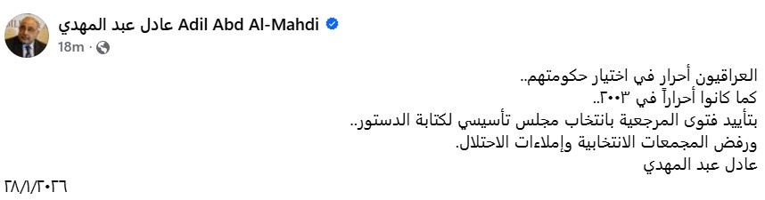 أكد رئيس مجلس الوزراء الأسبق السيد عادل عبد المهدي، اليوم الاربعاء ( 28 كانون الثاني 2026 )، أن العراقيين احرار في اختيار حكومتهم.