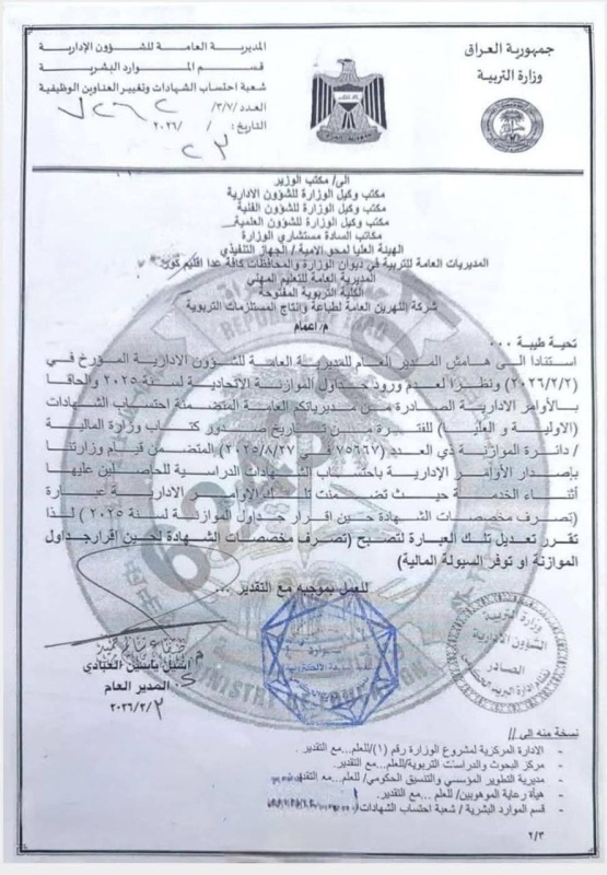 أظهرت وثيقة صادرة عن المديرية العامة للشؤون الإدارية في وزارة التربية، قرارا يقضي بتعديل فقرة احتساب مخصصات الشهادة، لتكون "لحين إقرار جداول الموازنة أو توفر السيولة المالية"، في إشارة إلى ربط صرف هذه المخصصات بالوضع المالي والتخصيصات المتاحة.