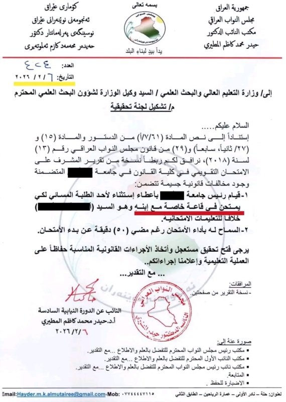اتهم النائب حيدر المطيري، اليوم السبت ( 7 شباط 2026 )، جهات لم يسمها بارتكاب مخالفات صريحة للتعليمات الامتحانية، مشيرا إلى ما وصفه بـ“ملف فساد صارخ” يتعلق بتمييز بعض الطلبة على حساب مبدأ العدالة وتكافؤ الفرص.