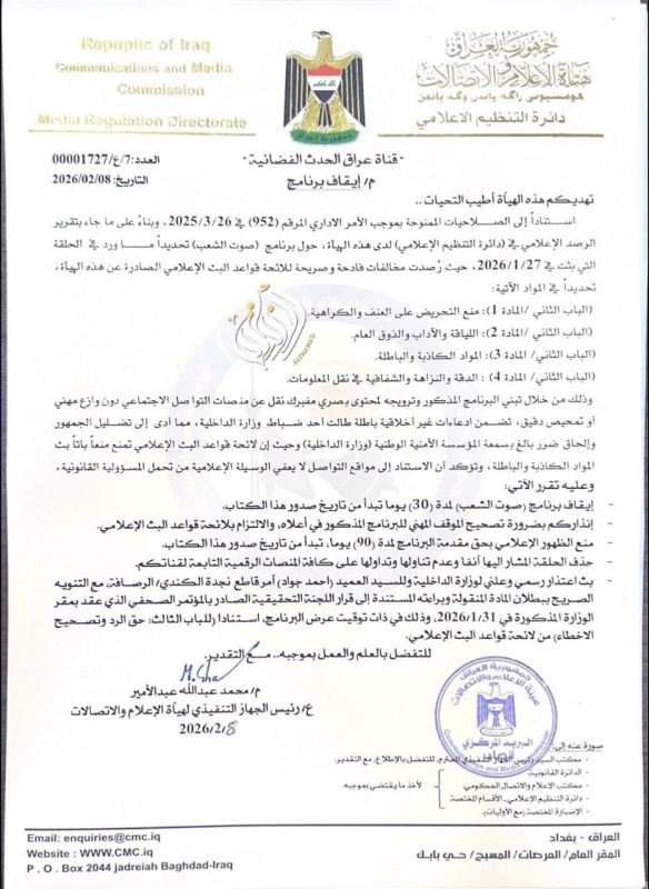 قررت هيئة الإعلام والاتصالات، اليوم الأحد، ( 8 شباط 2026 )، اتخاذ سلسلة من الإجراءات العقابية بحق قناة فضائية محلية، على خلفية محتوى برنامج أساء لضابط في وزارة الداخلية.