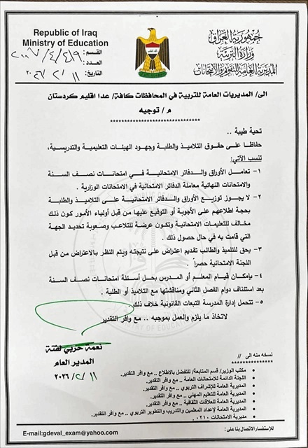 وأوضح المكتب الإعلامي للوزارة في بيان، أن توزيع الأوراق والدفاتر على التلاميذ أو الطلبة للاطلاع على الأجوبة أو التوقيع من قبل أولياء الأمور يعد مخالفة للتعليمات الامتحانية ويعرض العملية للتلاعب، مع صعوبة تحديد الجهة المسؤولة في حال حدوث أي خرق.