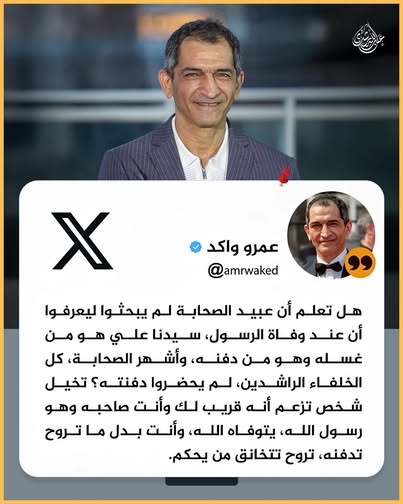 وكتب واكد على حسابه بمنصة إكس: "هل تعلم أن عبيد الصحابة لم يبحثوا ليعرفوا أن عند وفاة الرسول صلى الله عليه وسلم، سيدنا علي هو من غسله وهو من دفنه، وأشهر الصحابة، كل الخلفاء الراشدين، لم يحضروا دفنه؟ تخيل شخص تزعم إنه قريب لك وأنت صاحبه وهو رسول الله، يتوفاه الله، وأنت بدل ما تروح تدفنه، تروح تتخانق من يحكم بعده".