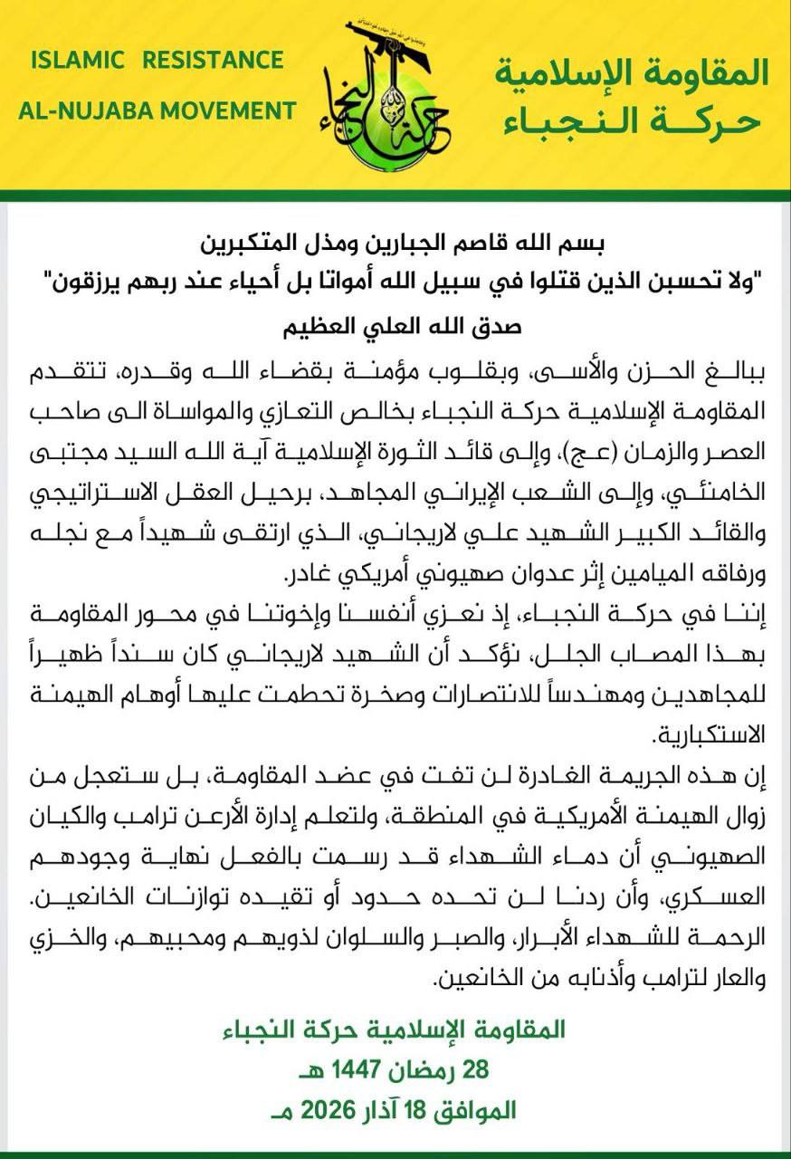 حركة النجباء: نؤكد أن الشهيد لاريجاني كان سنداً ظهيراً للمجاهدين ومهندساً للانتصارات وصخرة تحطمت عليها أوهام الهيمنة الاستكبارية