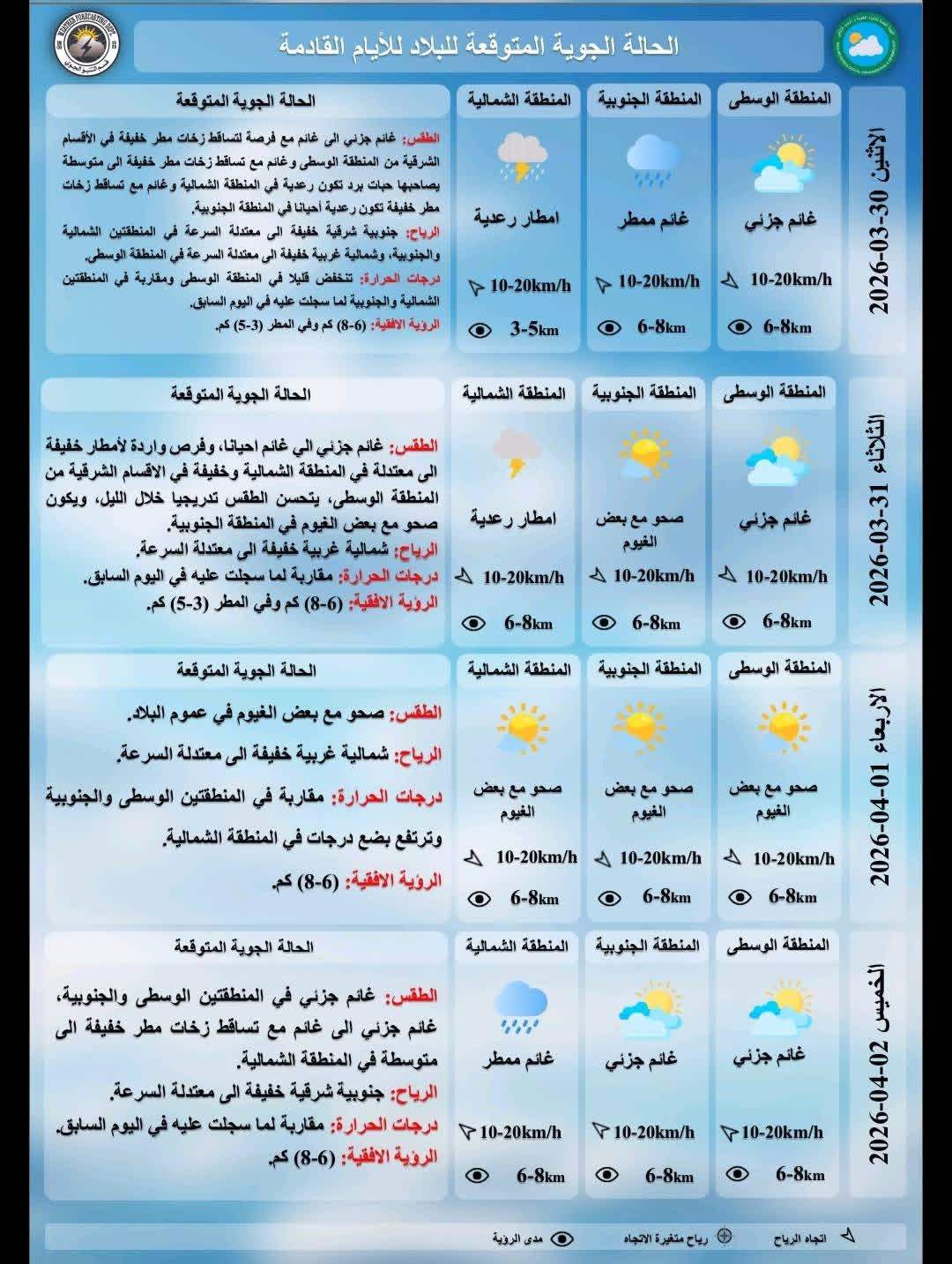 أعلنت هيئة الانواء الجوية، اليوم الأحد، عن تفاصيل حالة الطقس في البلاد للأيام المقبلة، فيما توقعت تساقطاً للأمطار وحبات البرد (الحالوب) يوم غد الاثنين.