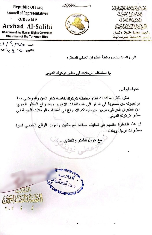 طالب رئيس الكتلة التركمانية في مجلس النواب ارشد الصالحي باستئناف الرحلات عبر مطار كركوك الدولي .
