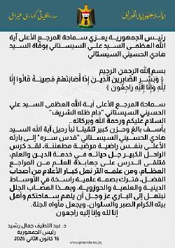 رئيس الجمهورية يعزي سماحة السيد علي السيستاني (دام ظله) بوفاة شقيقه
