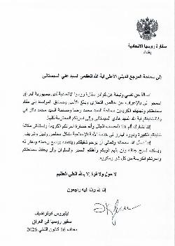السفارة الروسية في بغداد تعزي سماحة السيد السيستاني بوفاة شقيقه العلامة السيد هادي السيستاني (طاب ثراه).