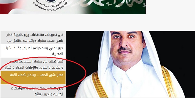 صحيفة الرياض السعودية عنونت: رغم “ممارساتها العدوانية” أمير قطر يعتبر إيران “قوة إسلامية كبرى”. واشارت الصحيفة الى ما ورد على وكالة الأنباء القطرية، أن «وزير الخارجية يعلن سحب سفراء قطر من السعودية ومصر والكويت والبحرين والإمارات، وطلب قطر مغادرة سفراء هذه الدولة خلال 24 ساعة”.