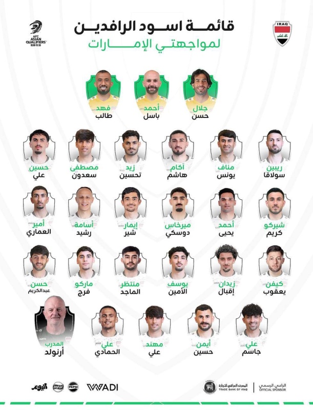 وقال ارنولد في تصريحات صحفية، إن " 25 لاعباً يمثلون العراق في طريق المونديال وهم: