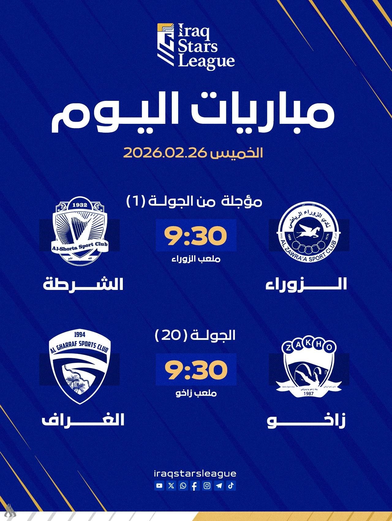 وفي سياق متصل، يستضيف فريق زاخو ضيفه الغراف في تمام الساعة التاسعة والنصف من مساء اليوم الخميس في افتتاح منافسات الجولة العشرين من دوري نجوم العراق.