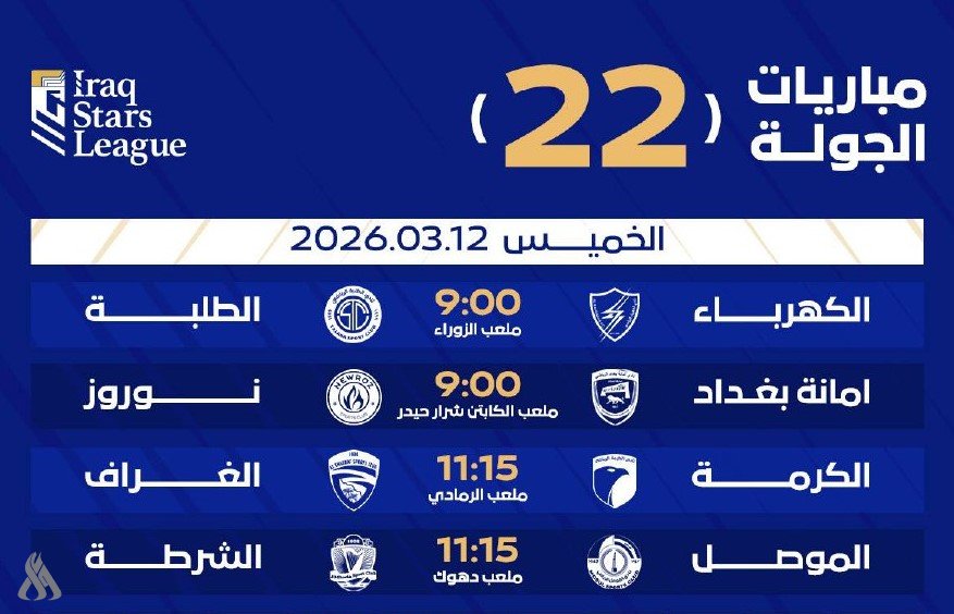 تنطلق، اليوم الخميس، منافسات الجولة الـ 22 من دوري نجوم العراق لكرة القدم بإقامة أربع مباريات مرتقبة، إذ يشهد ملعب الزوراء عند الساعة التاسعة مساءً مواجهة تجمع الكهرباء مع الطلبة، وفي التوقيت نفسه يلتقي أمانة بغداد مع نوروز على ملعب الكابتن شرار حيدر. وفي الساعة 11:15 مساءً، يستضيف الكرمة نظيره الغراف على ملعب الرمادي، بينما يحل حامل اللقب الشرطة ضيفاً ثقيلاً على الموصل في مواجهة تقام على ملعب دهوك، في ختام مباريات اليوم الأول من الجولة.
